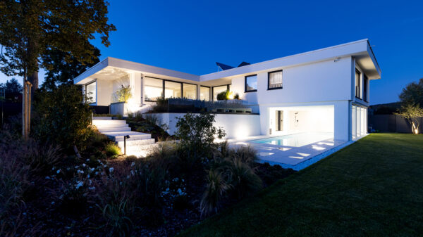 „Am Bildacker“ verkörpert modernes Wohnen mit klaren, weißen Fassaden, akzentuiert durch horizontale Holzverkleidungen. Großformatige, anthrazitfarbene Fenster lassen Tageslicht großzügig einfallen, während Balkone und begrünte Außenbereiche eine nahtlose Verbindung zur Natur schaffen.